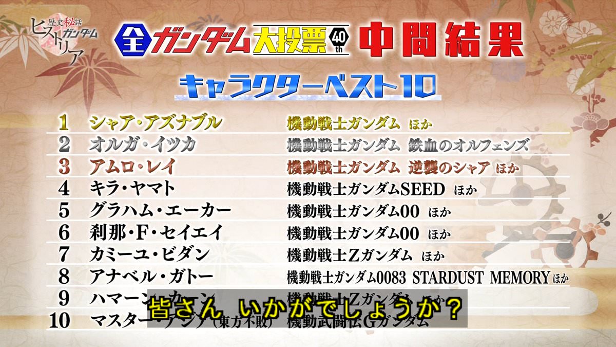 全ガンダム大投票キャラクターベスト10中間結果発表!あれオルガが…